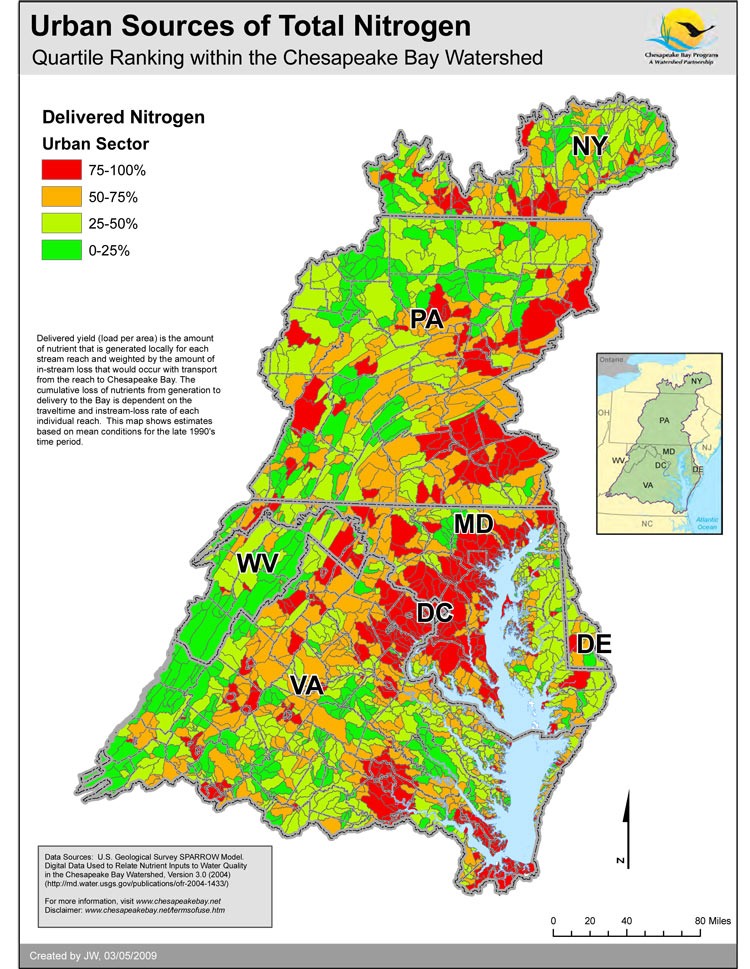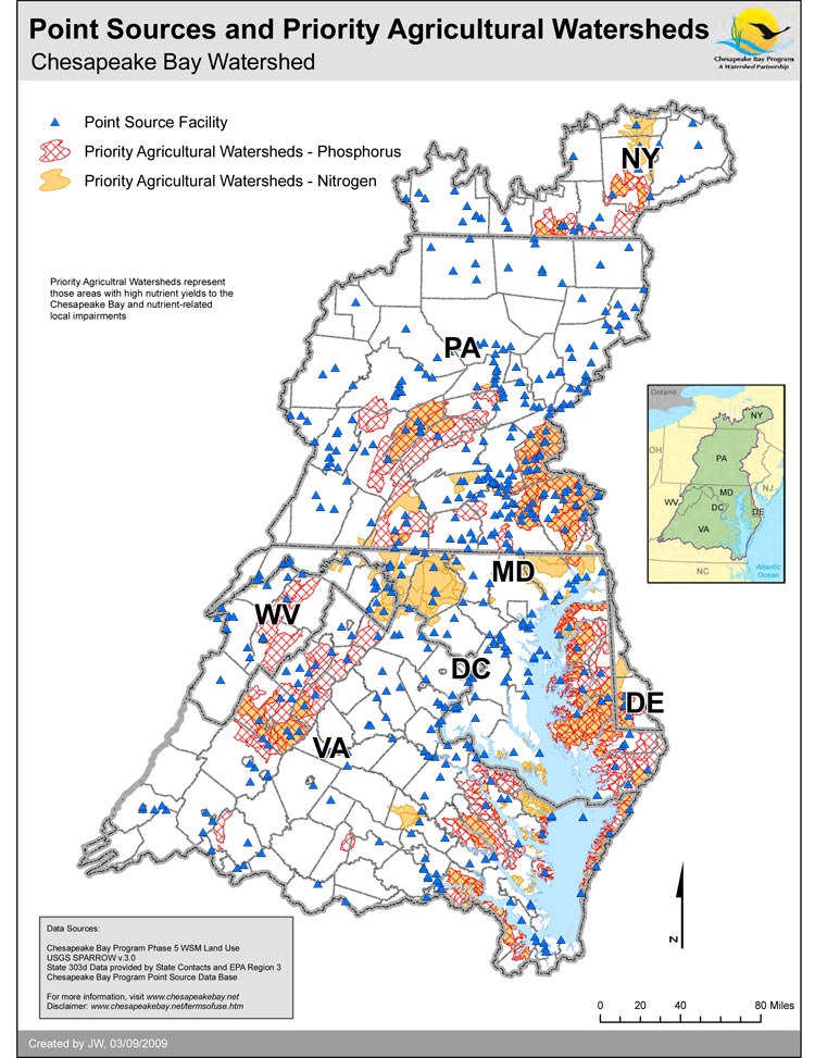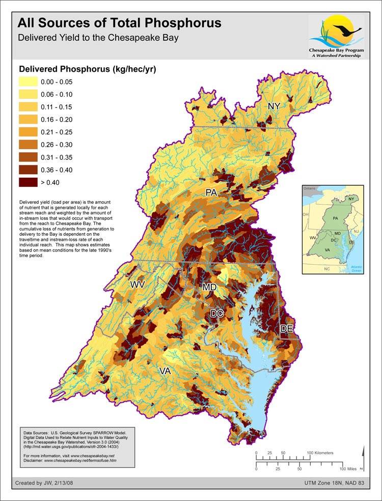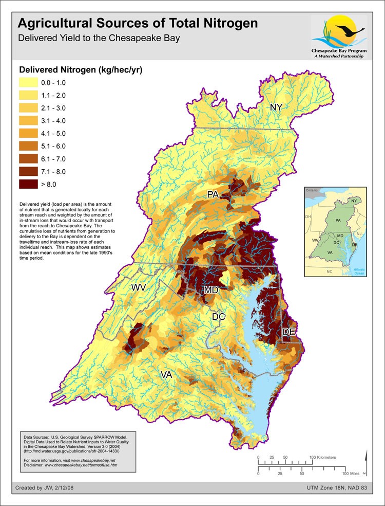 Virtually all people and industries in the Bay's seven-jurisdiction watershed — and even some beyond the watershed — contribute nutrients to the Bay and its tributaries. In general, excess nutrients reach the Bay from three major sources: specific, identifiable entry pipes; runoff from the land; and air pollution.