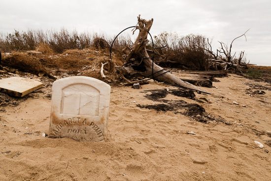 In October, a small cemetery was uncovered on Uppards by the winds and waves of Superstorm Sandy. Headstones in the graveyard bear the common surname Pruitt. The once-buried bones of those who died in the 1880s are now visible aboveground.