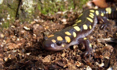 These grey, black or bluish salamanders can reach nine inches in length and have two rows of bright yellow or orange spots lining their backs. They spend most of their lives sheltered under leaf litter, logs and rocks.