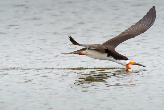 The bird is called a black skimmer because it skims along the surface of the water.