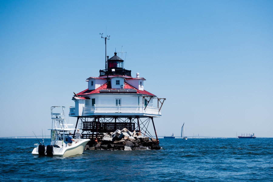 Thomas Point Shoal Lighthouse: Built in 1825 out of stone, eventually the Thomas Point Shoal Lighthouse became the only screw-pile lighthouse in the Chesapeake Bay. The lighthouse became a National Historic Landmark in 1999 and is still used as a navigational aid by the U.S. Coast Guard to this day.