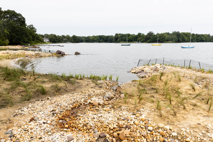 Schlieckert now calls the project a “win-win.” The bulkhead was removed and replaced with a shoreline that not only protects against erosion, but treats stormwater runoff coming from the roads and parking lot behind the center. Wetland grasses absorb the water on both sides, while a series of “step pools” upland of the beach manage all the stormwater. The shoreline also includes a long cobble structure that slows down waves and keeps the grasses in place.