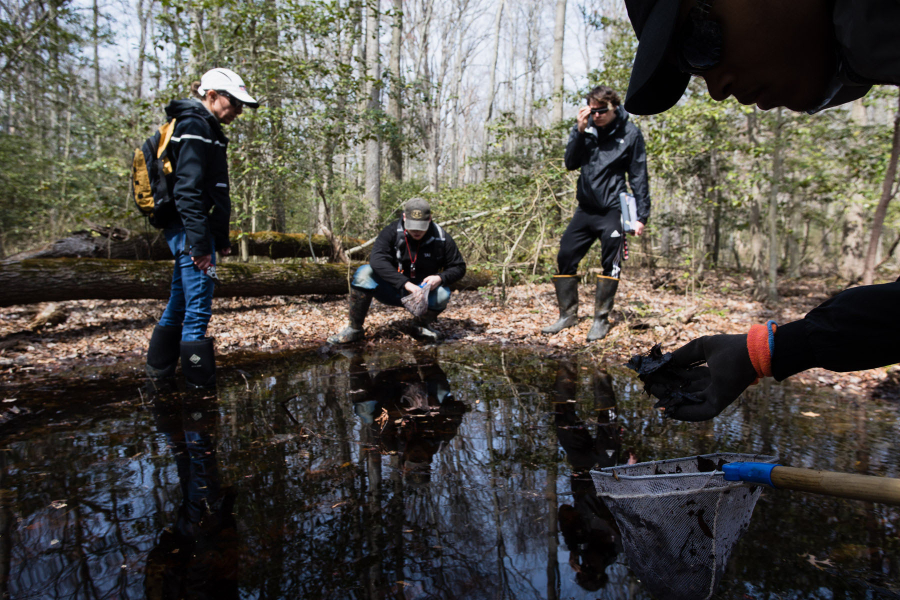 Now in her third year of the study, Lamont’s research not only answers her own questions and provides her students with an outdoor learning opportunity, it also serves the Maryland Department of Natural Resources (DNR), which owns Corcoran Woods. They were concerned about the vernal pools and if they were at risk of drying up. “If you’re managing the pools, you have to know what’s happening with them,” says Lamont. “They don’t have the staff to come out and do [the surveying], and it’s easy to get the students—they love it.”