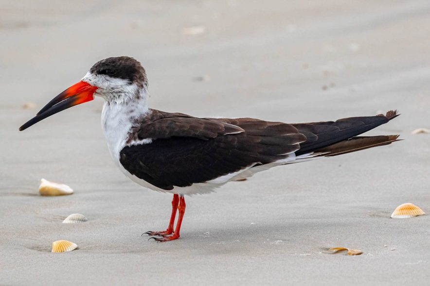 After black skimmers mate, they dig small holes in the sand that serve as nests for their eggs. The lack of undisturbed beaches—both up north and in South Carolina and Florida where they migrate from—is the primary reason that these birds are in decline. The smallest disturbance to a nesting colony can cause adults to scurry off, which leaves the young vulnerable to predators. Sometimes black skimmers simply can’t find safe nesting ground due to too much human disturbance.