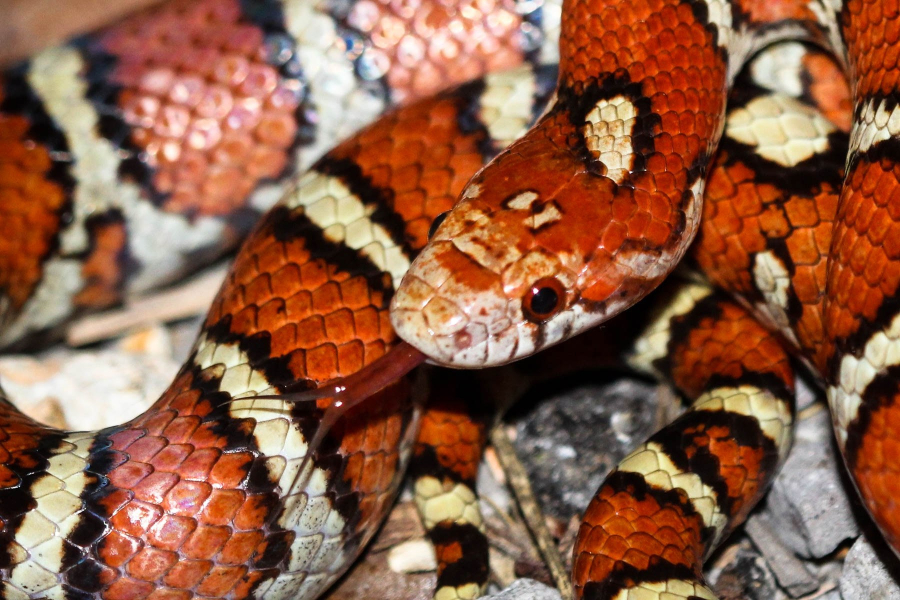 The Milk snake is a harmless, nonvenomous species that uses batesian mimicry to appear as the dangerous Coral snake, which is part of the cobra family. Both species have bright colors that alert danger to potential predators, despite the milk snake posing no real threat. Milk snakes are well equipped to protect themselves from predators, as they are also able to mimic rattlesnakes by vibrating their tails at the first sign of danger.