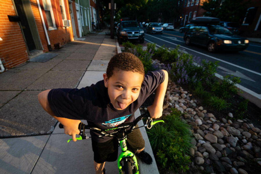 The Lawrences’ front door is bathed in sunlight almost until sunset, even after the rest of the block is cast into a mild evening shade. Still on his bicycle, Jaiden balances one foot on the edge of the rain garden in front of his home.