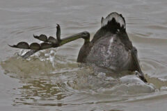 The coot feeds mostly on underwater grasses such as redhead grass, sago pondweed and wild celery. They will also eat small fish, insects and invertebrates. An American coot feeds by diving for food in deeper waters or “tipping up” its tail and submerging its head underwater in shallow waters. Coots are also known to steal food from nearby birds.