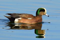 Wintering in the Bay, American wigeons are known for the green stripe and white spot on the heads of males.