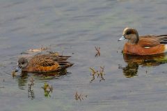 American wigeons mainly feed by dipping their bill into the water to pluck out insects and grass. They will also feed in fields as they use their short, goose-like bill to rip up vegetation.