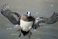 You can find American wigeons migrating in flocks, traveling mostly by day. When flying, the duck reveals the white underside of its wings.