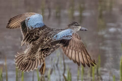 The blue-winged teal is a small dabbling duck with a chalky-blue patch on its forewing. It has a rounded head with a slightly large, black bill. The male has a blue-gray head with a bold white crescent on its face. It black speckles cover its gray breast and tan sides, and white patches appear on the sides of its rump. The female is brown and mottled, with a gray-brown scalloped pattern on its flanks and back. Females are smaller than males. Both have the powder-blue forewing patch and green on the back section of feather sknown as the speculum. The blue-winged teal typically grows to 14 to 15 inches in length, 10 to 18 ounces in weight and have a wingspan of 22 to 24 inches.