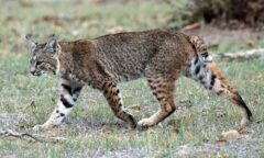 The bobcat is a wild cat that is brownish with dark spots and stripes. It lives mostly in forested and mountainous areas throughout the Chesapeake Bay watershed.