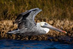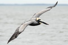 Flocks of brown pelicans fly in a long, straight line or a V formation with synchronized wingbeats and gliding. Sometimes a pelican will fly low over the water’s surface, almost touching it with its wingtips. It flies with its neck folded and head resting on its back.