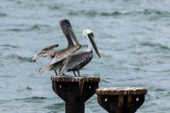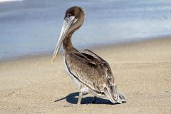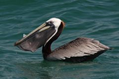 Brown pelicans grow to about 50 inches in length with a wingspan of 6 feet and weigh eight to ten pounds. Adults are mostly dark all over their body, with chesnut and white coloring on their neck and a pale yellow forehead. Their large, grayish bill is 9 to 15 inches in length, and there is an elastic throat pouch underneath the bill. Their legs and feet are grayish-black. Juveniles have a brown head and back with whitish underparks.