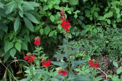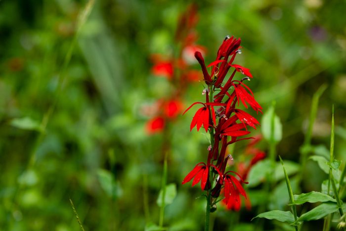 Cardinal flower is a native perennial plant with small, red, tubular flowers that bloom in late summer.