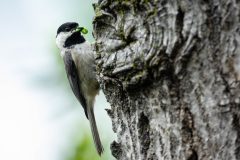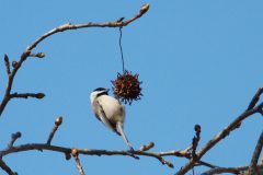 The Carolina chickadee feeds mostly on insects and spiders, but will also eat seeds and berries, especially in winter. They can often be seen at bird feeders in winter. It is acrobatic while feeding: chickadees hang upside down and tilt their head and body up to reach insects on leaves and tree bark. In winter, they live in small flocks of 2 to 8 chickadees to create a feeding territory, which they will defend from other flocks.