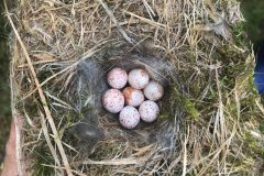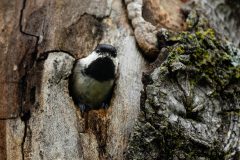 Pairing begins in winter. Some pairs may only stay together for a single season, but it appears that most chickadee pairs mate for life. Pairs find or construct a cavity within a dead tree or tree limb. Then the female builds a nest of moss, feathers and plant detritus (dead organic material) in the cavity. Chickadees will also nest in bird houses. The female lays 3 to 10 eggs, which are incubated for about two weeks. Young fledge about 16 to 19 days after hatching, and become independent 2 to 3 weeks after fledging.