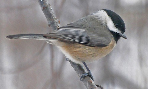 The Carolina chickadee grows to about 4.5 inches in length. It has a small, plump body with a short neck and a large head. It has white cheeks; a short, dark bill; and a black "cap" and "bib." Its back, wings and tail are a dark gray color, while its belly is whitish, often with buff-colored sides.
