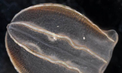 Two species of comb jellies can be found in the Chesapeake Bay: sea walnuts, Mnemiopsis leidyi, and pink comb jellies, Beroe ovata.
