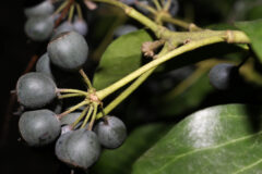 English ivy is an evergreen plant with pointed, waxy leaves that alternate along the stem. The flowers that bloom from the ivy are small and greenish-yellow in color. This plant can also be distinguished by its deep purple berries, which bloom in late autumn.