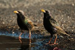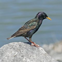 Starlings are stocky birds with short tails, triangular wings and long, pointed bill. They are mostly black. Their feathers are a purplish-green in the summer and more brown in the winter.