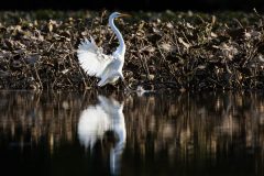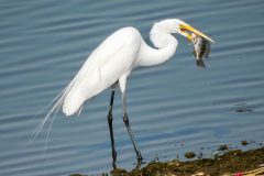 Great egrets eat fish, invertebrates, amphibians, aquatic insects and other small animals. To hunt, they silently stalks their prey in shallow waters, then plunge their bill into the water to capture it. They also steal much of their food from other, smaller herons and egrets.
