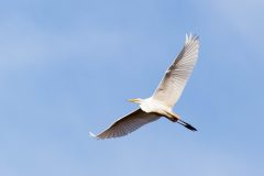 The great egret flies with slow, heavy wingbeats that push the bird up and down.