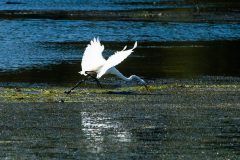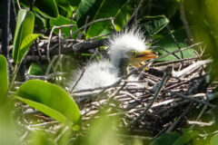 Great egrets nest and breed in colonies, called rookeries, with other egrets, herons and ibises. One of the Bay’s largest breeding colonies is in Canoe Neck Creek in St. Mary’s County, Maryland. Egrets usually begin arriving at the breeding colonies in mid-March; new breeders continue to arrive at the colonies into May. Their nests are made of sticks and located high in the canopy of a tree. Females will lay 3 to 5 eggs from early April to mid-June. Both parents incubate the eggs for about 24 days, and young fledge about 2 to 3 weeks after hatching. Most adults leave the breeding colonies between late August and mid-October. Great egrets usually live for approximately 15 years.