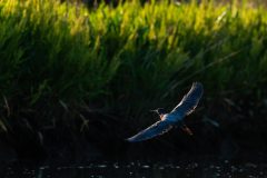 The green heron resembles a crow when flying. It flies with slow, steady wingbeats, often holding its chestnut neck in a bunched, S-shaped position in flight.