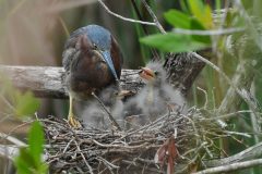 Green herons are considered semi-colonial because they may create a nest alone or in a colony with other herons. The birds usually begin arriving at breeding areas in early April. During courtship, the male extends his neck feathers and swells his throat in a sharp call, then hops from one foot to the other in front of a female.