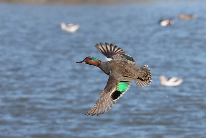 The green-winged teal is a small dabbling duck with iridescent green patches on its head and wings. It lives in tidal marshes and wetlands throughout the Chesapeake Bay and its rivers from autumn through spring.