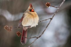 Cardinals eat seeds, insects and small fruits. Their cone-shaped bill allows them to easily crack open seeds. They will often eat grains from backyard bird feeders.
