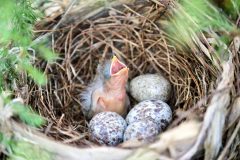 Newly hatched cardinal young are extremely immature and vulnerable: they cannot move, their eyes are closed and they have no down. They require intense care from both parents for about 10 days after hatching. After that time, they are able to leave the nest. As young male cardinals develop their brilliant red color, the male parent usually expels them from the nest.