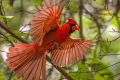 Pairs, which are monogamous, breed in March and again in May-July. They begin by establishing a breeding territory and exchanging songs. Females build a small, cup-shaped nest in a dense shrub, small tree or tangle of vines. They lay 3-4 eggs, usually two times per year. While the female incubates the eggs for about two weeks, the male aggressively guards the nest. Cardinals defend their territory so well that they will attack their own reflection in windows, mirrors and other shiny surfaces.