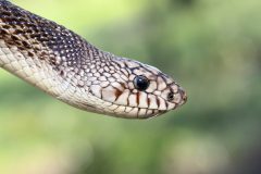 The northern pine snake is a dark patterned snake with a small head and a pointed snout. It lives in dry upland forests and can be found throughout the Chesapeake watershed.