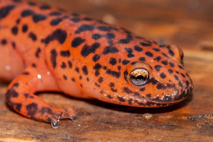 The northern red salamander is a small, reddish amphibian with black, irregularly shaped spots covering its back. It lives in cool freshwater streams and adjacent wooded areas throughout most of the Chesapeake Bay watershed.
