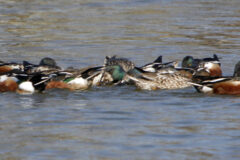 Northern shovelers are strong and direct fliers. When alarmed, they will twist and turn, revealing pale blue patches on their inner forewings.