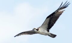 Osprey can be identified in flight by their crooked wings, white underparts and black eyestripes.