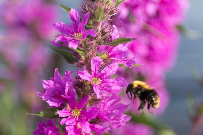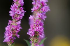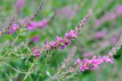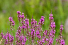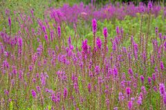 Purple loosestrife is an invasive perennial plant with spikes of bright purple flowers that bloom in mid- to late summer.