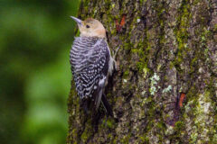 The red-bellied woodpecker is a medium-sized bird with pale coloring on its underside, a black and white patterned back and red flashes on its head and neck. The species has a sharply pointed black beak.
