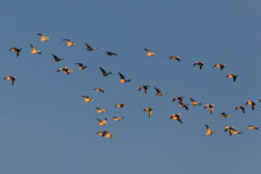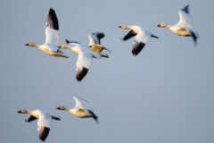 Flocks fly in long, diagonal or V-shaped patterns. Snow geese can be identified in flight by their white bodies and dark wingtips.