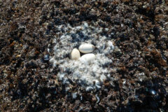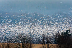 Snow geese do not breed in the Chesapeake Bay region; they return to the Arctic tundra to breed, where nesting colonies can number in the tens of thousands. White geese interbreed with those in the blue morph, tending to choose a breeding partner that resembles their parents’ coloring. Monogamous pairs usually form long-term bonds.