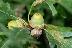 At age 20, the white oak starts to produce acorns, which are a light green to brown color with a shallow brown cap that covers about one-fourth of the nut. The acorns are thinner and more elongated than those of red or black oaks. The acorns will germinate in autumn, after falling to the ground.