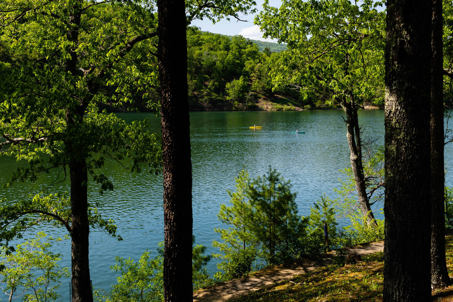 Kayakers cross Douthat Lake, which feeds into Wilson Creek and the Jackson River, a tributary of the James River in Bath County, Va., on May 12, 2018. The upper James River was the healthiest region in the Chesape ((Photo by Will Parson/Chesapeake Bay Program))