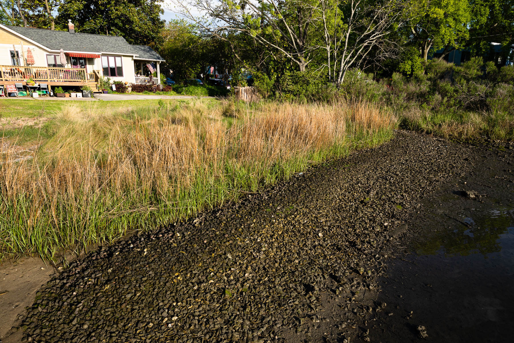 Environmental Concern providing some oversight of the work, and the ERP worked with another local contractor to mentor them on the project as well. They installed a sill, which is a rock structure placed parallel to the shore, placed sand behind the sill, and then planted a variety of marsh grasses in the sand Oysters were also planted along the water—and new oysters have been “recruited” naturally. Honey, a trained naturalist, was able to choose her own plants, which she says really come alive mid-Spring to summer.