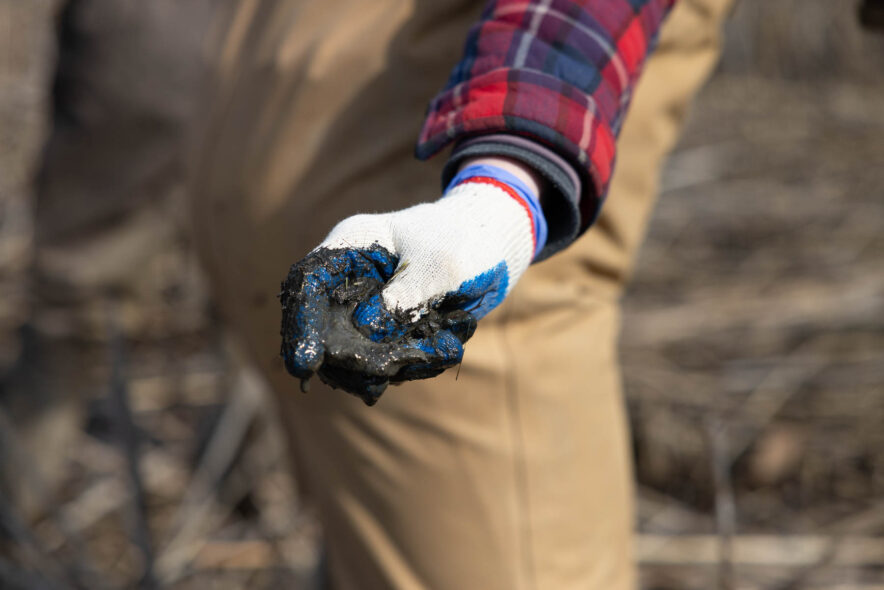 “We’re going to mix it with mud from the wetland,” Montero said, taking a handful from below his feet. “And then what we’re going to do is mix it thoroughly, until it looks like cow dung, basically.”