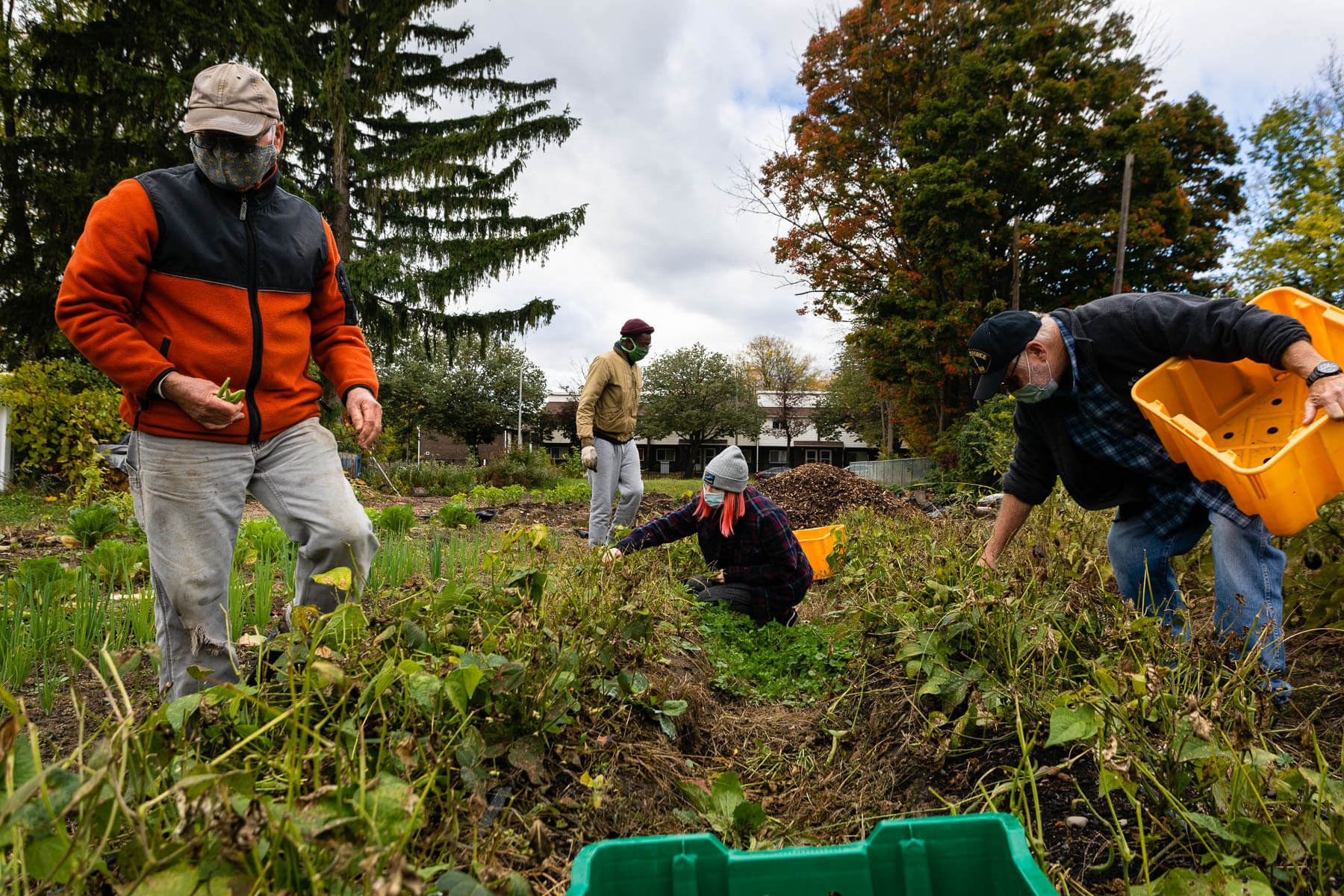 Volunteers help program assistant Jibreel Cooper, center left, harvest produce at Binghamton Urban Farm in Binghamton, N.Y. A federally supported buyout program has allowed the farm to quadruple its acreage. (Photos by Will Parson/Chesapeake Bay Program)