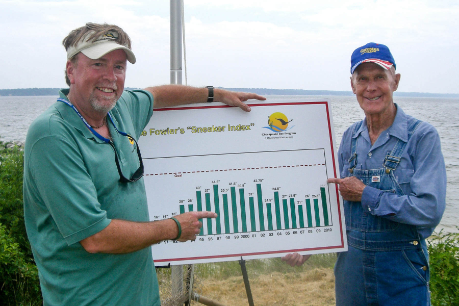 The "sneaker index" is a measurement of the deepest point at which Fowler can still see his white sneakers as he wades into the Patuxent River.