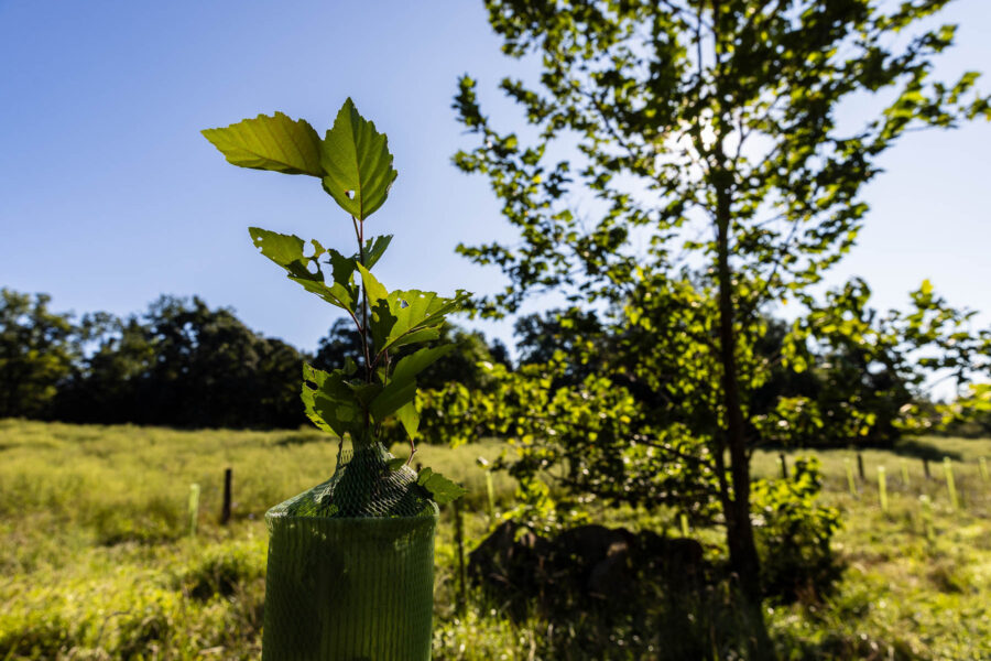 Young tree pokes out of a tree tube with a larger tree in the background.