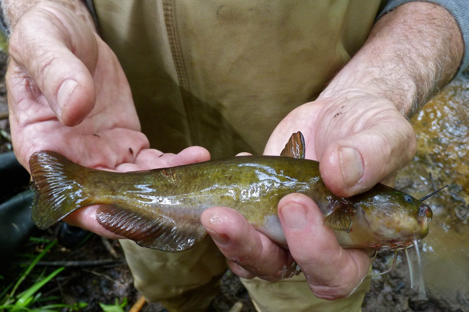 The brown bullhead is a freshwater catfish with a mottled, brownish body and slightly notched tail that grows to be about a foot in length. This species is native to the Chesapeake region and can be found in ponds, lakes, streams and rivers throughout the Bay watershed. They can tolerate a range of temperatures and oxygen levels and are able to survive in fairly polluted waters. On average, they live for about seven years.